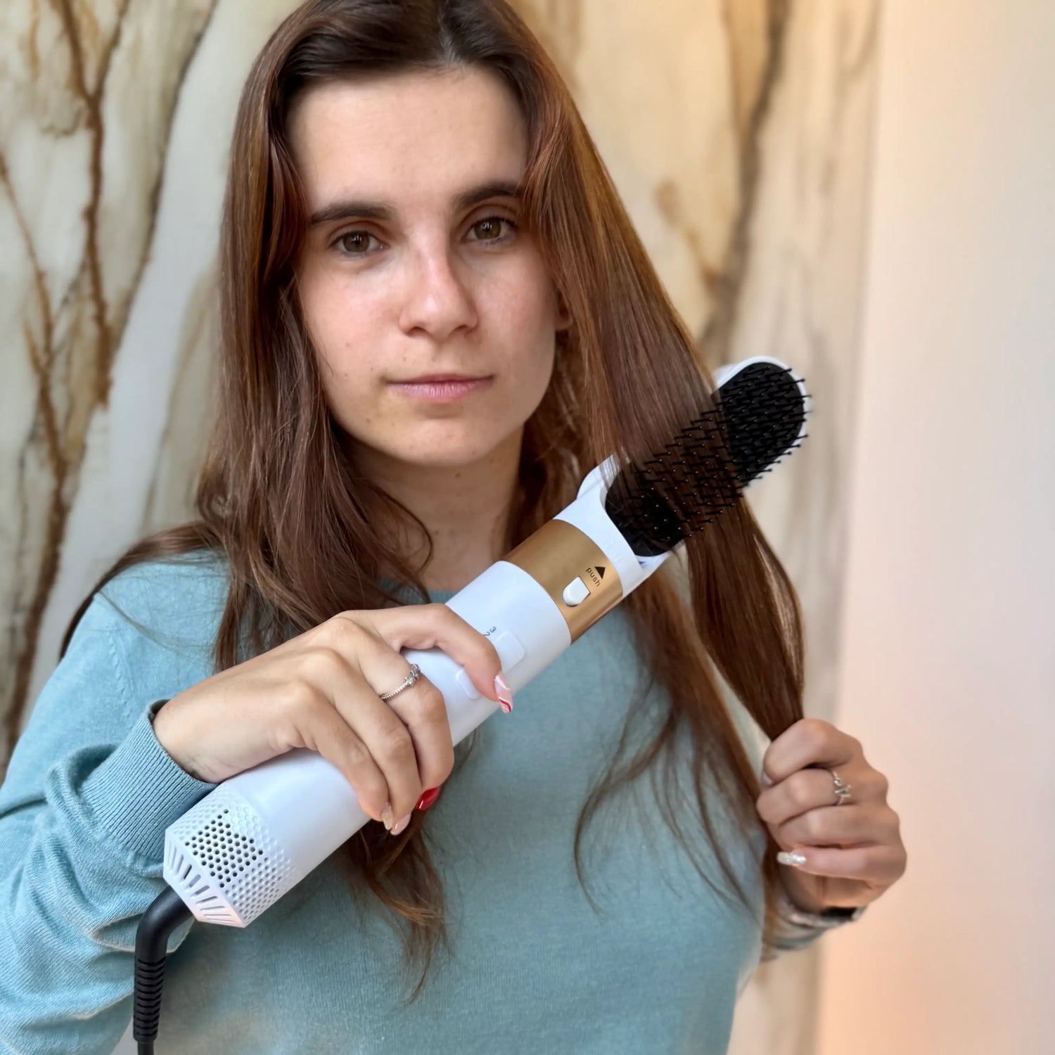 Air Glow™ transforma tu rutina capilar en minutos. Gracias a su tecnología profesional y 5 accesorios intercambiables, puedes secar, alisar, rizar y dar volumen con un solo dispositivo.